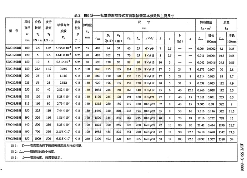 注:1、一般情況下按所傳遞轉(zhuǎn)矩和軸承壽命選擇萬向聯(lián)軸器,也可根據(jù)機(jī)械設(shè)備的具體使用要求,只校核扭轉(zhuǎn)強(qiáng)度或軸承壽命中的一項(xiàng);
